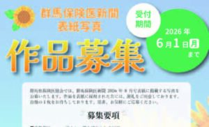 - 新聞表紙写真作品募集画像をクリックするとPDFが開きます。 群馬県保険医協会では、群馬保険医新聞2026年8月号に掲載する表紙写真を公募いたします。 作品を表紙… 続きを読む: 新聞表紙写真作品募集