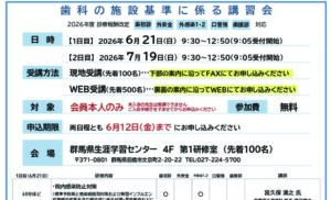 - 【歯科】口腔機能実地指導料の施設基準に係る講習会【日時】 2026年5月17日(日)14:00~15:30(13:30受付開始) 【受講方法】 現地… 続きを読む: 【歯科】口腔機能実地指導料の施設基準に係る講習会