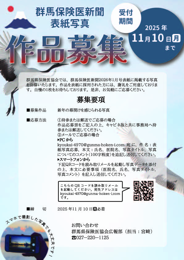 新聞表紙写真作品募集 8月 27, 2025 最終更新日時 : 10月 2, 2025 admin 画像をクリックするとPDFが開きます。 群馬県保険医協会では、群馬保険医新聞2026年1月号に掲載する表紙写真を公募いたします。 作品を表紙に採用された方には、謝礼をご用意しております。 自慢の1枚をお待ちしております。是非、お気軽にご応募ください。 締切を延長しました(2025/10/2)