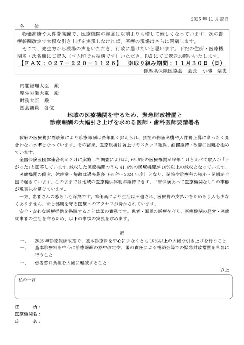 会員のみなさまには全国保険医新聞11月5日号に署名用紙を同封させていただきました。