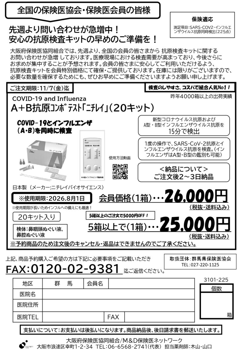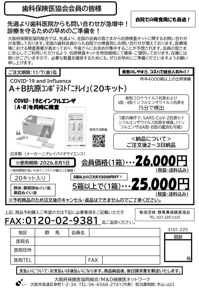 会員のみなさまへのサービスの一環として、大阪府保険医協同組合と共同でニチレイ 「COVID-19 and Influenza A+B抗原コンボテスト(20キット)」を会員価格にてご提供いたします。